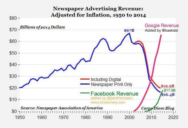 El colapso económico llega con Internet (desde 2007): cae la publicidad y también la venta de ejemplares (pérdida de control de la distribución al digitalizarse); los incentivos empresariales empujan a recortar investigación y buscar ingresos como sea.